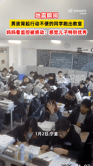 1月2日,宁夏银川。地震一会儿,高中男生绝不游移背起后桌行径未便的同学冲出教室。孩子姆妈称,看到这个视频,合计女儿尽头优秀。